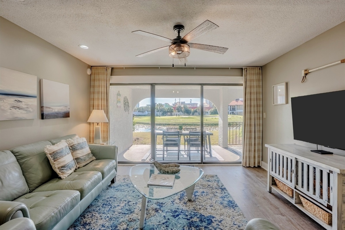 The Tipsy Turtle PCB is a gorgeously decorated and perfectly situated two bedroom, two bath villa for six guests. It's well-appointed interior features a comfy living area with couches, smart TV, large dining table, fully-equipped kitchen with all appliances (large and small) plus dishes/pots/pans/utensils for all meals, and access to one of the largest covered double patios on property. Enjoy dining al fresco as you look over the pond full of turtles, ducks and water lillies and then beyond to the iconic 8th island green of the Edgeater golf course.